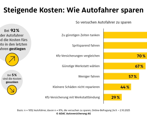 Foto: ADAC e.V.Autofahren wird für die meisten immer kostspieliger: Neun von zehn Fahrern (92 Prozent) haben in den letzten Jahren gestiegene Nutzungskosten erlebt, wobei fast jeder Zweite sogar von einem starken Kostenanstieg berichtet.…