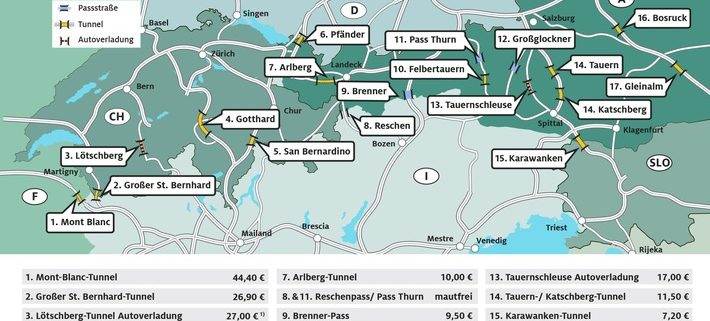 Ganz gleich, ob eine von der Strecke abhängige Maut oder eine Vignette bezahlt werden muss – in den Alpen werden viele Pässe und Tunnel zusätzlich berechnet. Um hier den Überblick zu behalten hat der ADAC eine Grafik mit den aktuellen Kosten zusammengestellt und veröffentlicht.