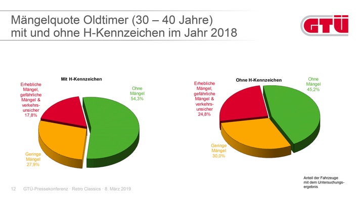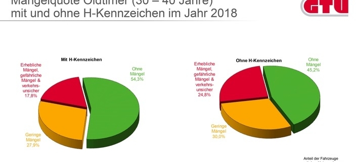 Ein völlig anderes Bild geben die Klassiker aus der Vorkriegszeit: Bei den für den Straßenverkehr zugelassenen Oldtimern der Baujahre 1920 bis 1940 sind 81,6 % der Fahrzeuge in meist sehr gepflegtem Zustand und ohne jegliche Mängel. Lediglich 14,9 % der historischen Fahrzeuge aus diesem Zeitraum weisen „geringe Mängel“ auf, bei nur 3,5 % stellten die GTÜ-Prüfingenieure „erhebliche und gefährliche Mängel“ fest.