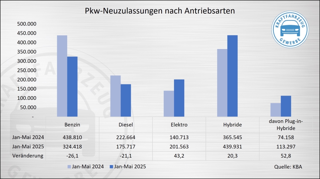 Die Anzahl E-Neuzulassungen lag im Mai bei 43060 Fahrzeugen und damit um 44,9 Prozent über dem Vorjahresmonat, bei einem Markanteil von mittlerweile 18 Prozent der Gesamtzulassungen.