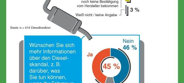 Unentschieden sind die Dieselfahrer in der Frage des Informationsbedarfs: 46 Prozent wollen sich nicht weiter damit beschäftigen, fast genauso viele würden gern mehr wissen. 9 Prozent sind unentschlossen. Wenn ihr Auto vom Dieselskandal betroffen wäre, würden 35 Prozent erst mal nichts unternehmen und abwarten. 23 Prozent würden es in der Werkstatt nachrüsten und 14 Prozent würden es zwar nachrüsten, aber ansonsten abwarten. Mehrfachnennungen waren möglich. Die wenigsten würden ihr Auto wegen des Dieselskandals so schnell wie möglich verkaufen oder den Hersteller auf eigene Kosten verklagen. Sogar nur ein Viertel der Dieselfahrer, die eine Rechtsschutzversicherung besitzen, würde sie dafür in Anspruch nehmen. 10 Prozent wissen nicht, was sie tun würden.