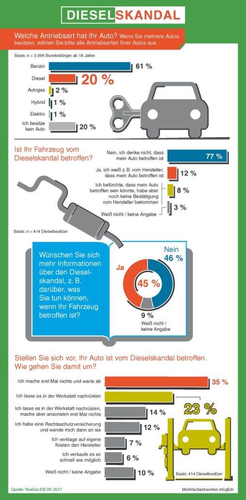 Wie stehen deutsche Autofahrer zum Dieselskandal? Im Auftrag der DEVK hat das Meinungsforschungsinstitut YouGov Anfang 2017 über 2.000 Bundesbürger repräsentativ befragt. Demnach fahren 61 Prozent der Deutschen heute einen Benziner, 20 Prozent haben ein Auto mit Dieselmotor und weitere 20 Prozent geben an, kein Auto zu besitzen. Die Antriebsarten Autogas (2 Prozent) sowie Hybrid und Elektro (je 1 Prozent) sind hierzulande kaum unterwegs. Von den über 400 befragten Dieselbesitzern vermuten 20 Prozent, dass ihr Auto vom Dieselskandal betroffen sein könnte. 12 Prozent wissen es bereits. Dreiviertel der Dieselfahrer denken allerdings, dass ihr Fahrzeug nicht zu den beanstandeten Modellreihen gehört.