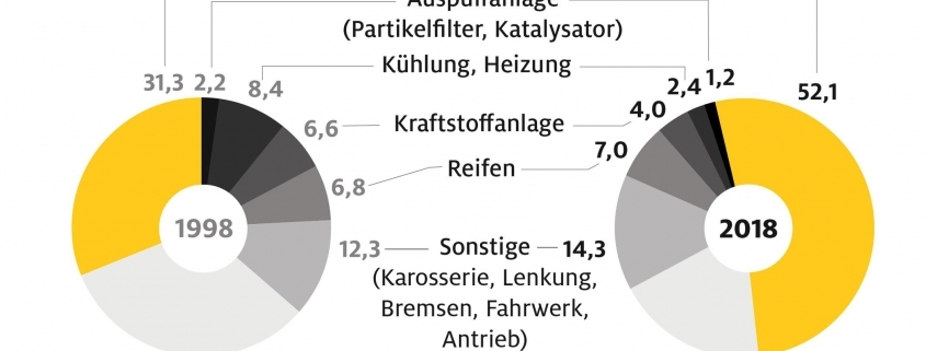 Zurückgegangen ist hingegen die Zahl der Pannen, die das Motormanagement betreffen. Dazu zählen zum Beispiel Einspritzung, Sensorik und Zündung. Während 1998 noch 32,5 % der Pannen aus diesem Bereich kamen, waren es 2018 nur noch 19 %. Der Grund: Die Technik hat sich in den vergangenen Jahren deutlich verbessert, sodass es hier seltener zu Ausfällen kommt.