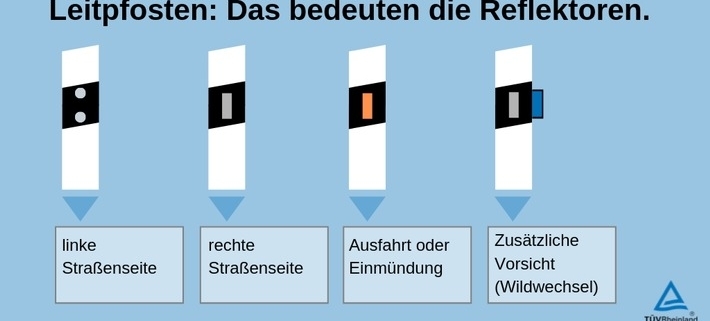 Die Leitpfosten liefern nicht nur Rückschlüsse auf die Sichtweite, sondern ihre Rückstrahler auch Informationen. An der rechten Straßenseite sind sie eckig, an der linken rund. Leuchten sie orange, verweisen sie auf eine Ausfahrt oder Einmündung. Bei blauen Reflektoren ist zusätzlich Vorsicht geboten, sie deuten auf Wildwechsel hin.