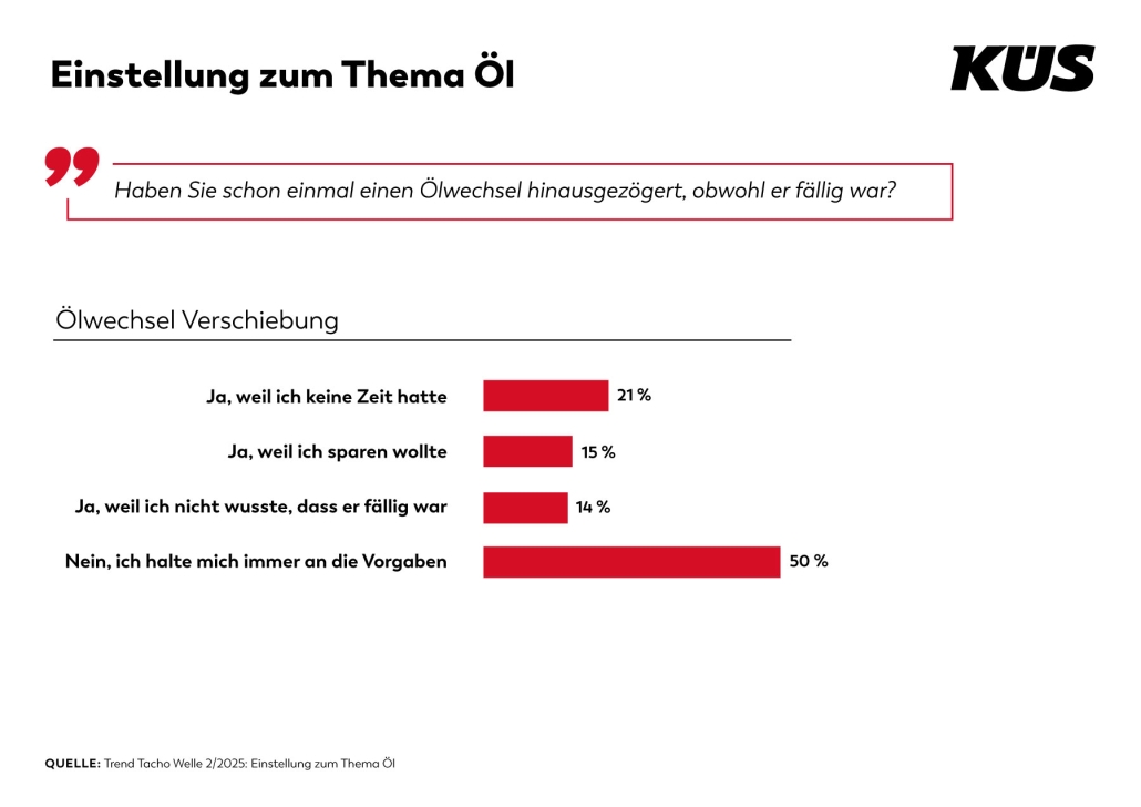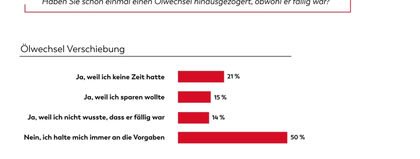 Trotz dieser bekannten Risiken gaben 21 Prozent der Befragten an, den Ölwechsel aus Zeitmangel verschoben zu haben. Auf Platz zwei der Verzögerungsgründe folgen finanzielle Zwänge: 15 Prozent verzichteten aus Kostengründen auf einen rechtzeitigen Ölwechsel. Erst danach nannten die Fahrer mangelnde Kenntnis über die Fälligkeit (14 Prozent) als Ursache.
