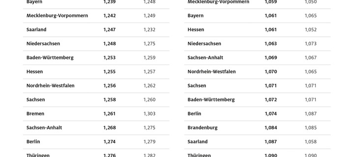 Diesel ist derzeit ebenfalls in Rheinland-Pfalz am günstigsten. Ein Liter kostet hier durchschnittlich 1,059 €, ebenso in Mecklenburg-Vorpommern. Bayern und Hessen folgen knapp dahinter mit einem Mittelpreis von 1,061 €. Verbraucher bezahlen aktuell in Bremen für Diesel mit 1,097 € pro Liter am meisten. Die Differenz zum günstigsten Bundesland liegt bei 3,8 Cent.