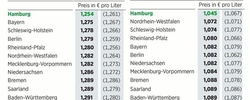Auch bei Diesel haben die Hansestädter klar die Nase vorn. Für einen Liter müssen sie derzeit 1,045 Euro hinlegen. Im Vergleich zu Thüringen und Sachsen ergibt dies einen Preisvorteil von 5,5 Cent je Liter. Auf Platz zwei rangiert Nordrhein-Westfalen 1,072 Euro pro Liter vor Schleswig-Holstein 1,074 Euro pro Liter.