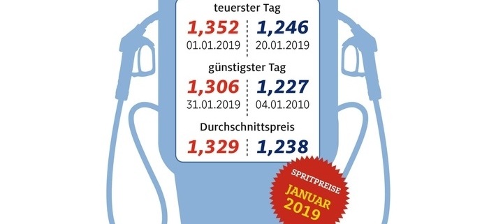 Die Preise für Sprit sind im ersten Monat des neuen Jahres spürbar gefallen. Damit setzt sich der Trend, der schon im November 2018 begonnen hatte, auch im neuen Jahr fort. Wie die monatliche Marktauswertung des ADAC herausarbeitet, mussten Autofahrer im Januar für einen Liter Super E10 im bundesweiten Monatsmittel 1,329 Euro bezahlen, das sind 19,7 Cent weniger als im November. Diesel wurde damit im Vergleich zum November im Schnitt um 19,3 ct auf 1,238 € je Liter günstiger.