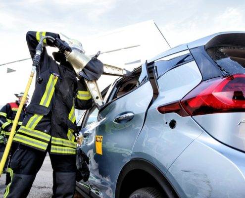 ADAC testet mit Feuerwehr Personenbefreiung aus dem Elektrofahrzeug.