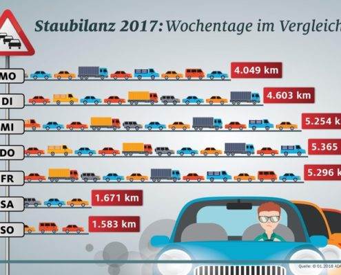 Foto: ADACDie Autofahrer mussten im vergangenen Jahr auf den deutschen Autobahnen häufiger und länger im Stau stehen als in den vergangenen Jahren. In seiner aktuellen Staubilanz für 2017 zählt der ADAC rund 723.000 Staus, das sind etwa…